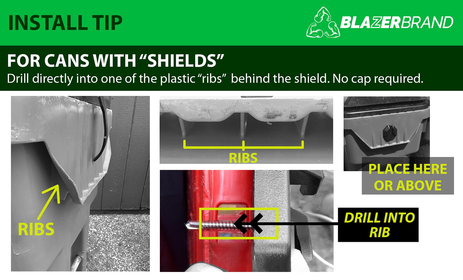 Step 3 | Install the Retainer onto the lid of your trash can where the long narrow section of the strap will lay. Drill the retainer through the lid and fasten a cap to the screw on the inside. (Note: The role of the retainer is to keep the strap in a convenient place, and to make it possible to unlock the strap and open the lid in one swift movement.)